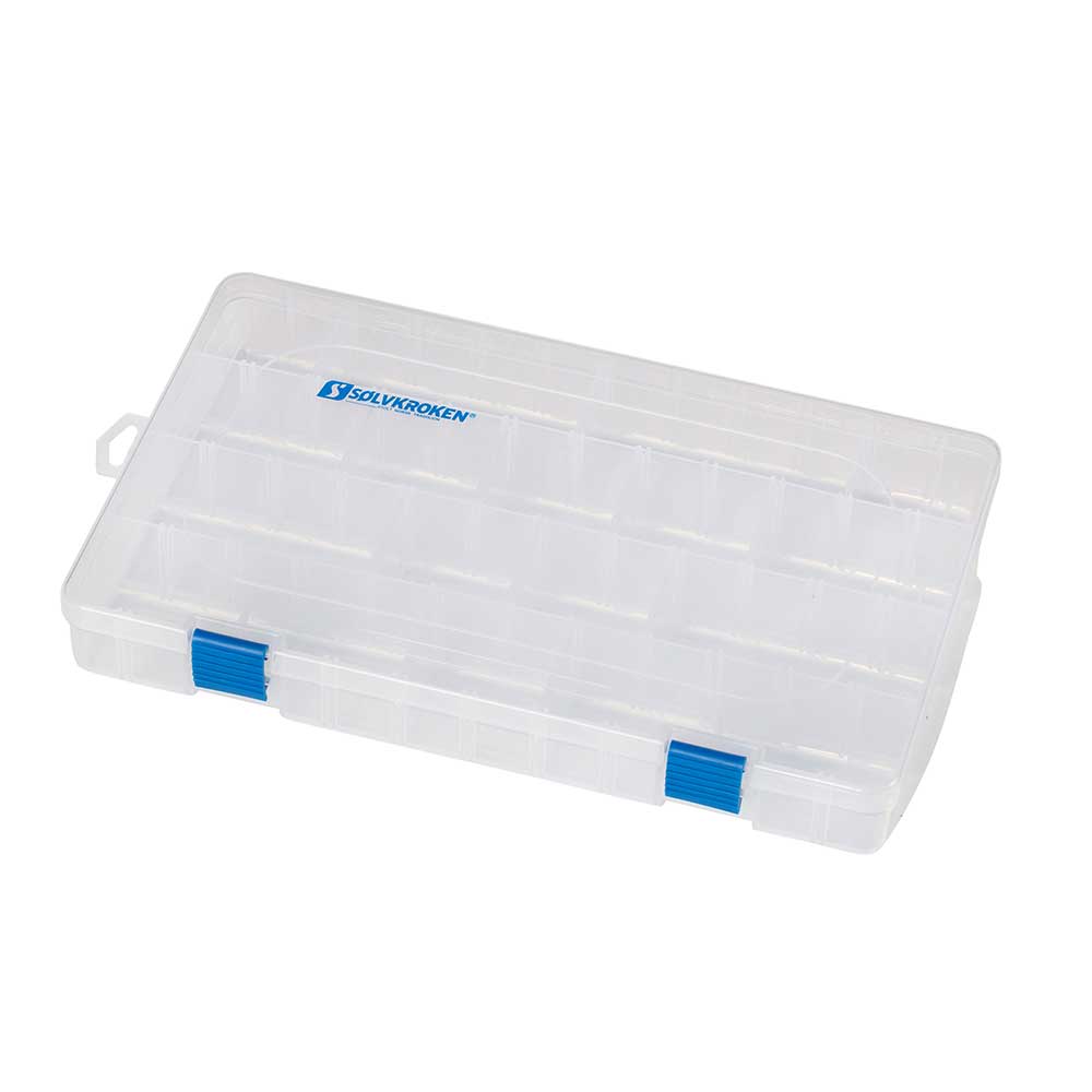 Stort og solid slukskrin fra Sølvkroken. Stort og solid slukskrin fra Sølvkroken. Slukboksen har både faste rom og mange løse romdelere, noe som gir deg mange valgmuligheter for oppbevaring av favorittutstyret. Denne slukboksen har en ny type lukkemekanisme som er både sikker og praktisk! Størrelse: 36 x 22 x 5 cm.