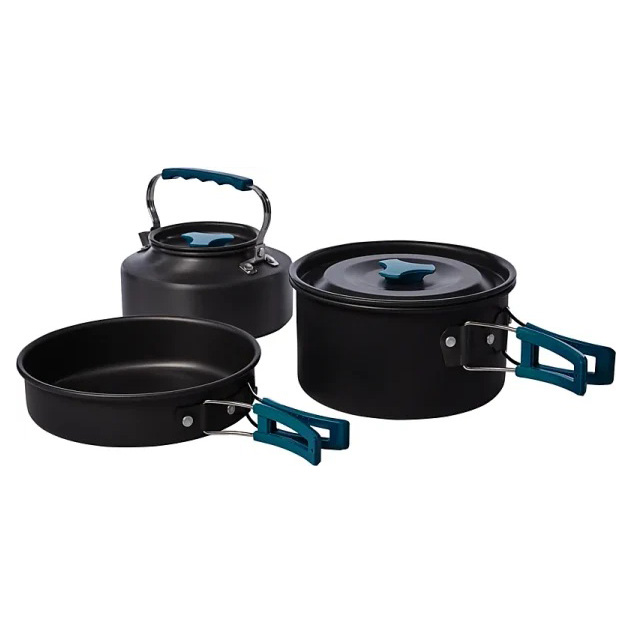 Sett med vannkoker, kjele og stekepanne. Perfekt for camping og tur. Laget av robust og slitesterk aluminium. Lett og tar minimalt med plass i ryggsekken.