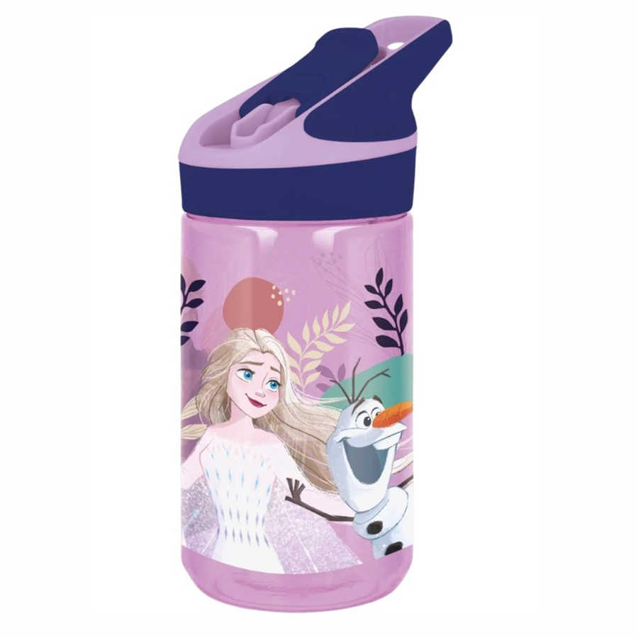 Frozen drikkeflaske med drikketut i silikon er designet i svært slitesterk tritan-plast. Flaskens tut ligger beskyttet under lokk som åpnes ved hjelp av trykknapp. Drikketuten er koblet til sugerør for enkelt å drikke av flasken. Tritan inneholder ikke BPA og er et svært slitesterkt material.
