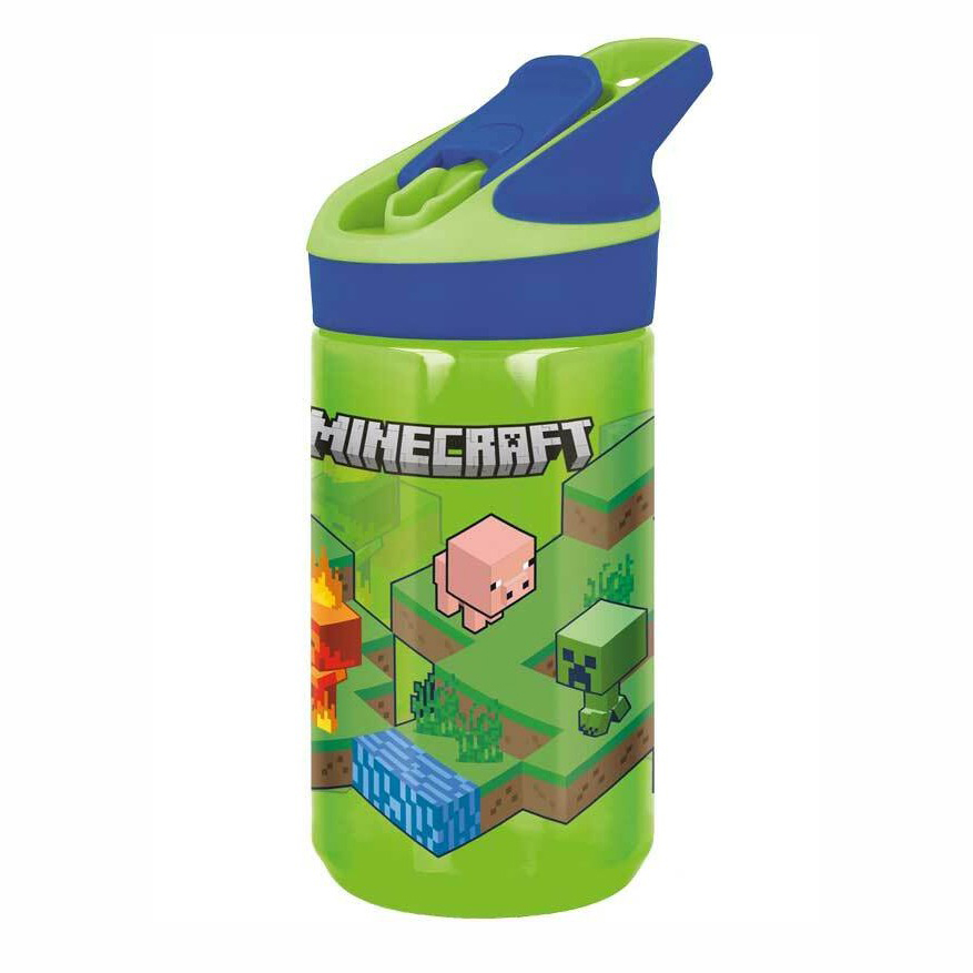 Minecraft drikkeflaske med drikketut i silikon er designet i svært slitesterk tritan-plast. Flaskens tut ligger beskyttet under lokk som åpnes ved hjelp av trykknapp. Drikketuten er koblet til sugerør for enkelt å drikke av flasken. Tritan inneholder ikke BPA og er et svært slitesterkt material.