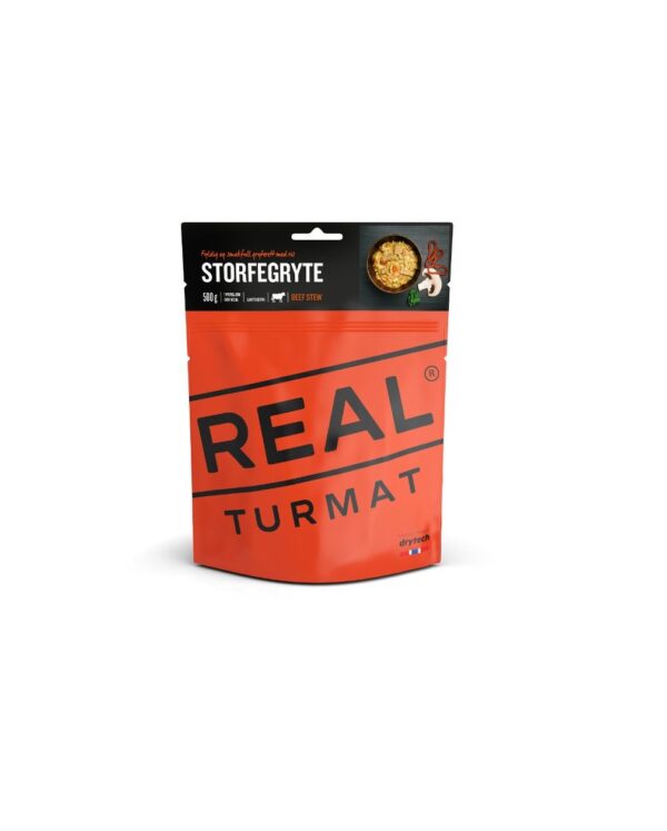 Posene tar liten plass og veier lite så de er ypperlig å bære med i sekken. Denne versjonen er en smakfull storfegryte. Produktet har 5 års holdbarhet fra produksjonsdato. Lagres ved romtemperatur. Åpen pose skal behandles som ferskvare. Måltidet bør spises innen 2 timer etter at vann er tilsatt. Riv av toppen på posen ved rivehakket. Tilsett varmt vann (3,9 dl) til nivåmerket. Rør godt rundt lukk posen med poselåsen og la retten hvile i 8 minutter. Allergener: gluten. Ingredienser: Ris (37%) paprika (16%) storfekjøtt (storfekjøtt (84%) potetstivelse stabilisator (E450 E451) salt antioksidant (rosmarinekstrakt)) (12%) løk (11%) hvetemel rapsolje sjampinjong (4,4%) kjøttbuljong (gjærekstrakt maltodekstrin salt rapsolje kjøttekstrakt brunt sukker løk) krydder sukkerkulør (karamell maltodekstrin) hvitløkspulver antioksidant (askorbinsyre).