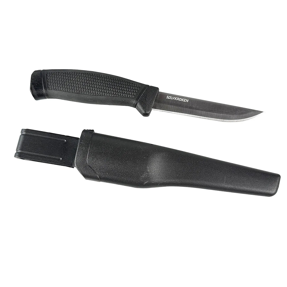 Fin allroundkniv med blad i rustfritt stål og solid gummihåndtak. Kniven kommer i en solid slire med praktisk belteklips. Lengde knivblad: 10cm. totalvekt med hylster per kniv.: 104 g.