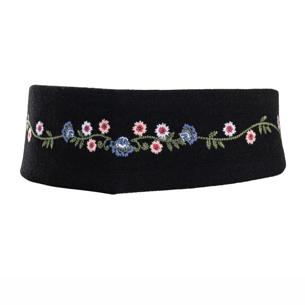 Hårbånd i ullblanding med vakre broderier og justerbar strikk med knapp. Materiale: 50% ull / 50% viscose. Fôret med 100% polyester. Vi anbefaler å fjerne eventuelle flekker med en fuktig klut. Hårbåndet kan vaskes på skånsom håndvask ved 30 °C.